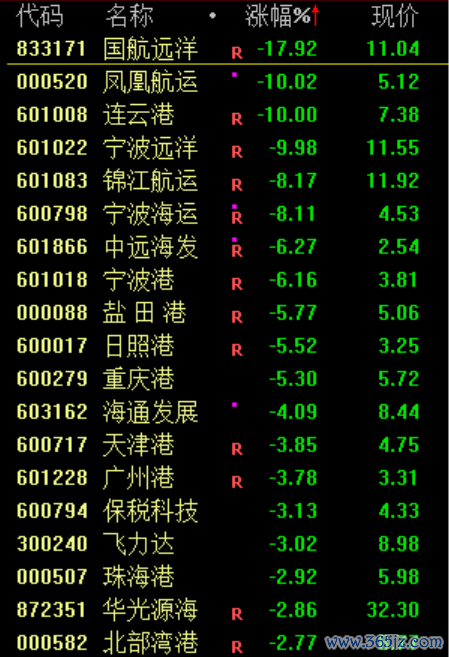 下跌方面,航运板块迎来调整,凤凰航运、连云港等跌停。