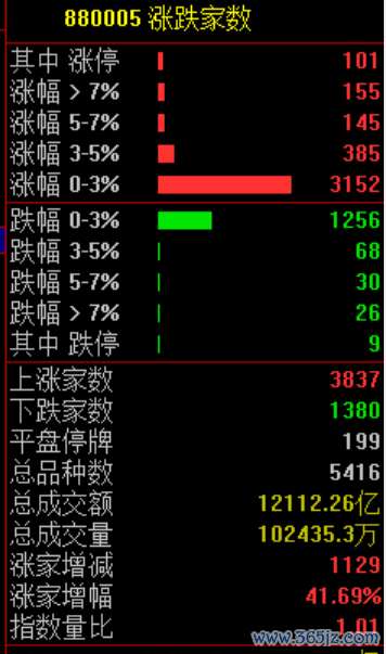 两市共3837只个股上涨,101只个股涨停,1380只个股下跌。